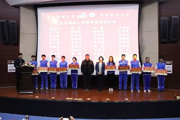 徐长节、李必亚、洪佳、邓卫权、段戈宏为获得江西国际公司奖(助)学金的50名同学颁奖。