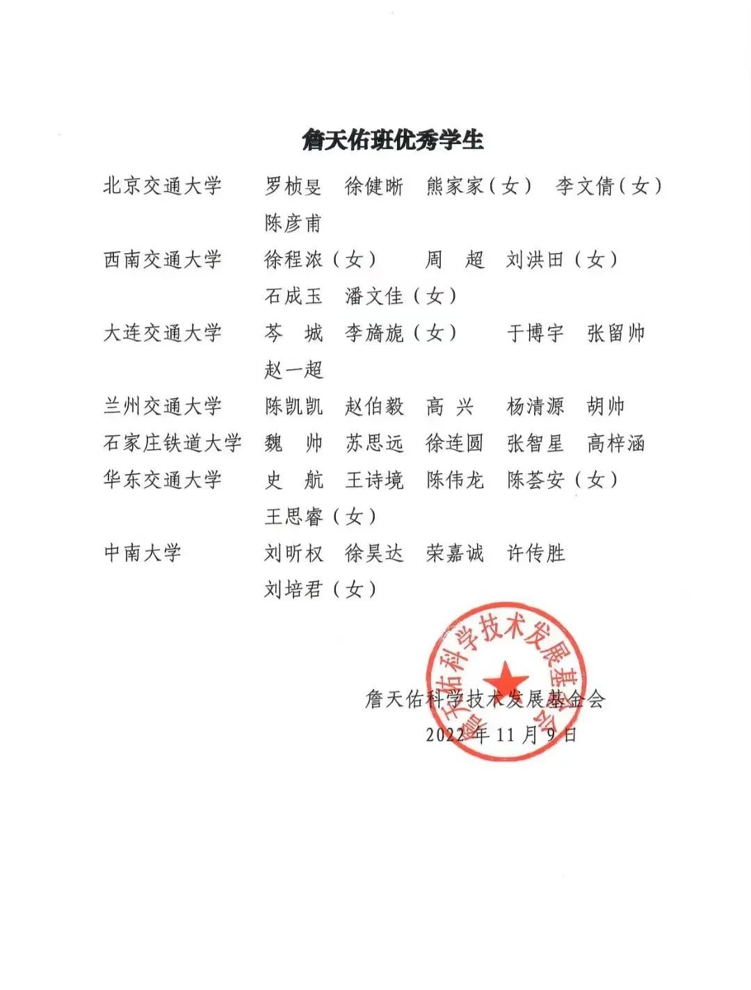 根据詹天佑科学技术发展基金会《詹天佑班管理办法》,经各学校推荐,詹天佑基金会秘书处审定,确定2022年度奖励詹天佑优秀班集体7个、詹天佑奖学金获得者35名。嘟嘟成人网 2020级土木(城轨詹天佑)班获评2022年度詹天佑班优秀班集体,史航、王诗境、陈伟龙三名同学获评2022年度詹天佑班优秀学生。