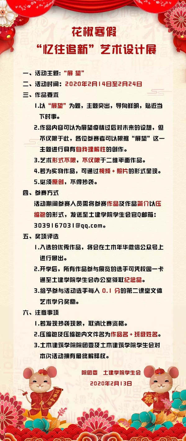 2.开学后,所有作品参与展览的选手可凭校园一卡通至土建学院学生会办公室领取纪念品。