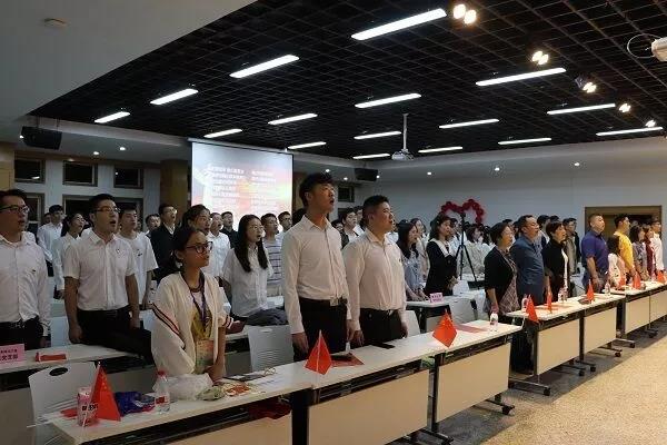 各支部书记和副书记分列舞台两侧,深情朗诵《可爱的中国》,他们配合默契,雄壮男声与柔和女声的转换中体现了对祖国的深情赞美和对美好未来的殷切期盼。