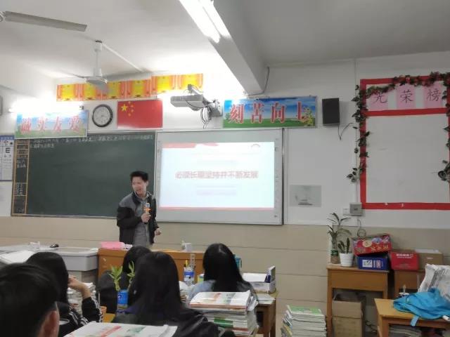 2018年1月25日,在广东省化州市林尘中学,土建学院学生第二党支部苏观胜向高三理科195班学生开展了“‘花椒’学子返乡宣讲十九大精神”宣讲会。宣讲的主题内容是:“学习贯彻十九大精神,践行中国特色社会主义”。